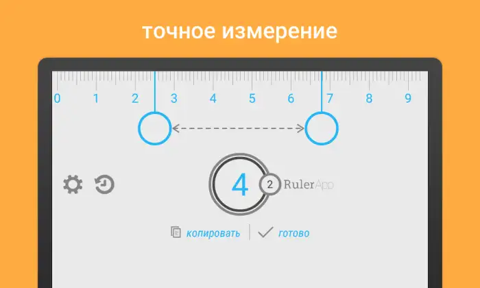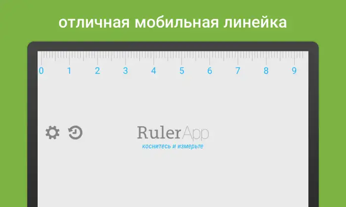 Линейка — измерительный прибор для определения длины, ширины, высоты и прочих параметров объектов в сантиметрах или дюймах. Есть интерфейс на русском языке, реклама, кнопки: «Готово», «Копировать». Присутствует меню настроек, где можно калибровать инструмент. Программа работает на основе технологии мультитач. Возможно копирование данных в буфер обмена. Доступен просмотр истории измерений с датами, вычисленными размерами. Имеются возможности смены темы, выбора расстояния на экране.
