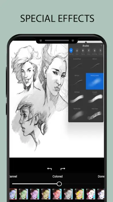 Create Pro Art — фоторедактор для генерации, редактирования изображений. Присутствуют наклейки, кисти, 250 специальных эффектов, шрифты. Можно создавать формы, выбирать мазки, настраивать линии сечения, маски. Есть функции повтора, отмены, удаления, масштабирования. Доступен набросок эскизов в блокноте с применением инструментов: карандаша, ручки, держателя заливки, водяной маскировки.