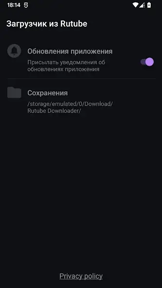 «Скачать видео с Рутуба» — загрузчик для сохранения роликов, опубликованных на одноименном видеохостинге, по ссылке. Можно выбирать параметры видеофайлов, включать уведомления об обновлениях программы. Ограничения по количеству закачанных публикаций отсутствуют. Загруженный контент сохраняется в галерее устройства и отображается как список миниатюр с названиями, размерами файлов. Есть реклама, темная тема, интерфейс на русском языке. Имеется встроенный плеер для просмотра видеороликов в автономном режиме.
