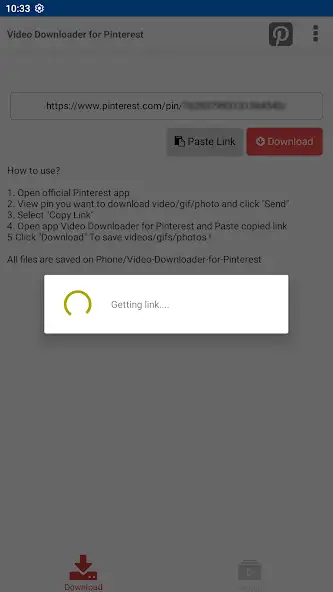Video Downloader for Pinterest — загрузчик для сохранения контента с одноименного веб-сайта по URL-адресу. Есть реклама, которую возможно убирать, светлая тема, функция обратной связи. Интерфейс на русском языке отсутствует. Присутствуют инструкции по использованию программы. Можно делиться ссылкой на приложение с другими пользователями, узнавать стадию закачки.