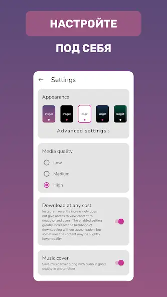 Insget — загрузчик для сохранения изображений, роликов из интернета по ссылке. Возможна закачка коротких вертикальных и длинных клипов длительностью до 60 минут. Имеется реклама. Есть светлая тема. Программа подходит для скачивания контента из социальной сети Instagram*. Доступна закачка альбомов, историй. Клипы, изображения загружаются в галерею устройства. Присутствуют функция автоматической загрузки, инструменты просмотра, инструкции.