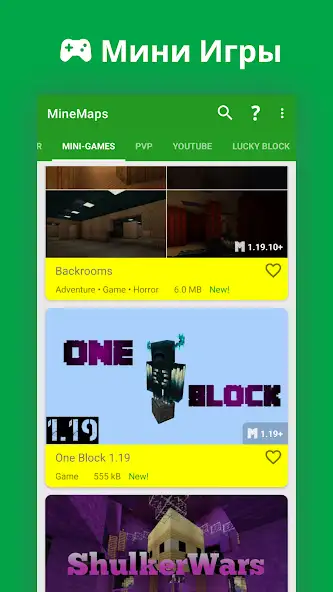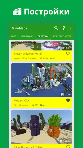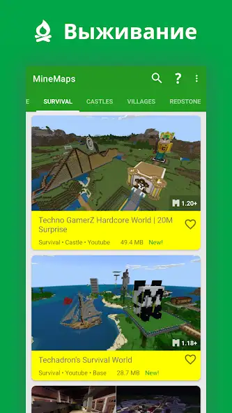 «Карты для Майнкрафта» — мод, который добавляет в одноименную песочницу элементы выживания, соревнования, приключения, паркура; населенные пункты, строения и прочие объекты. Аддоны доступны для скачивания. Моды отображаются в виде списка миниатюр с названиями, жанрами, размерами файлов. Присутствуют скриншоты, описания и прочая информация. Есть мини-игры, навигация по вкладкам: «Хоррор», «Города», «Дома», «Аниме», «Деревни», другим.