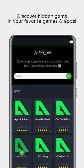 GAME MOD — каталог модов для запуска игрового контента в жанрах экшена, стратегии, раннера, шутера, симулятора, гонок и других. Есть функция поиска аддонов. Присутствует всплывающее меню с пунктами: Home, Games, Apps. Доступна отправка ссылки на приложение другим людям. Моды отображаются как список миниатюр с наименованиями, номерами версий, рейтингами и датами публикаций. Имеется просмотр описаний контента.
