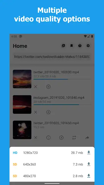 Download Twitter Videos — загрузчик видеозаписей и GIF-изображений из одноименной социальной сети для проигрывания их на девайсе. Скачивает медиаконтент с помощью копирования URL или функции «Поделиться». Позволяет загружать два или более файла одновременно, выбирать разрешение для их сохранения, например, HD и SD, отслеживать загрузочный процесс, заходить в историю загруженных медиафайлов.