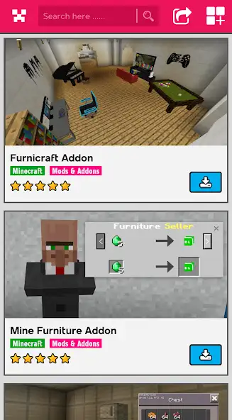 Имеется декор: вазы, статуи, светильники, занавески, лампы, другой. Присутствует электроника, к примеру, ноутбуки, компьютеры. Есть двери, окна, забор и прочие объекты. Моды показываются как список миниатюр с названиями, рейтингами. Приложение Furniture Mod For Minecraft содержит рекламу. Можно играть с другими пользователями онлайн. Интерфейс на русском языке отсутствует. Имеются функция поиска, панель инвентаря, описания и скриншоты.