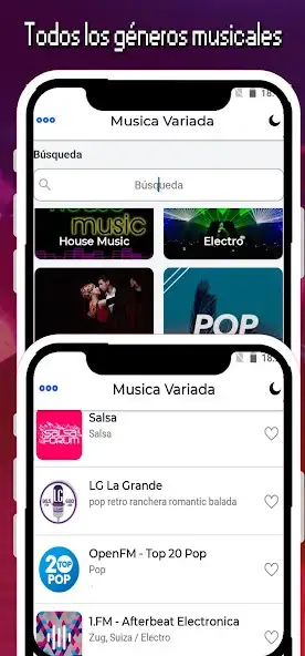Musica Variada — каталог радиостанций для прослушивания музыки жанров: попа, реггетона, электро, сальсы, хауса, хип-хопа, диско и прочих. Присутствуют вкладки: «Станции», «Любимые», «Поиск», «Подкасты», My radios. Станции радио показываются списком с миниатюрами, названиями, местами вещания, жанрами, количеством просмотров. Есть оценка радиоканалов лайками в виде сердца.