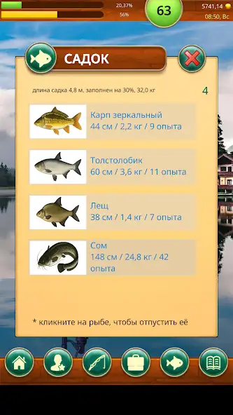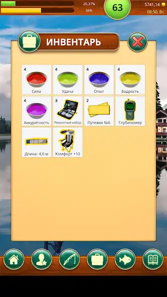 - Просмотр глубины водоемов, прогресса, характеристик рыб и прочей информации.