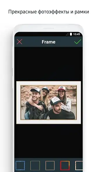 Есть предварительный просмотр внесенных изменений, конвертация фотоснимков в HD-изображения. Присутствуют фоторамки. Можно отправлять снимки другим пользователям в социальные сети Facebook* и Instagram*. Присутствует выбор соотношений сторон 3 : 4, 1 : 1, 16 : 9, 4 : 3, иных. Имеется реклама.