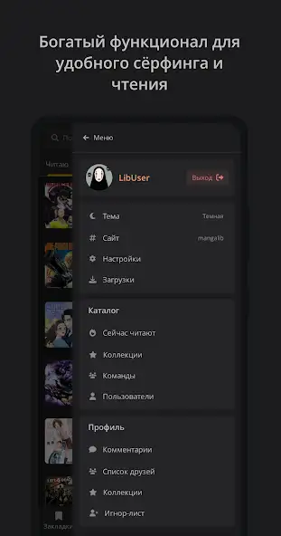 MangaLib — библиотека электронных книг жанра манги для прочтения в онлайн- или офлайн-режимах. Присутствует встроенный поиск с фильтрами, ежедневные обновления, темная тема. Доступно более пятидесяти жанров, таких как психология, романтика, комиксы. Есть русскоязычный интерфейс. Имеется реклама.