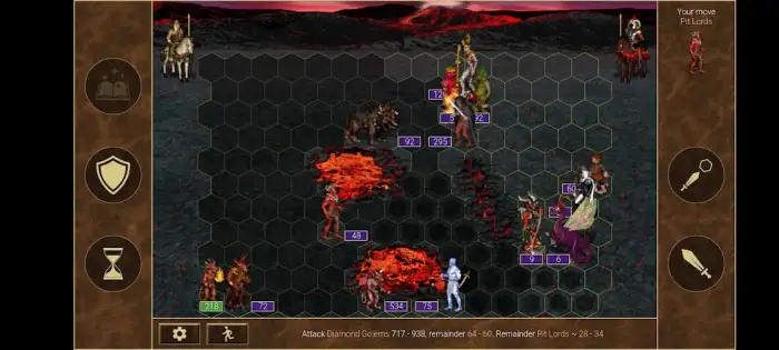 На экране отображаются виртуальные кнопки включения режима обороны, атаки, управления ходом, открытия книги заклинаний, активации артефактов и способностей. Имеются информация о персонаже и происходящем боевом действии, параметры отрядов, например уровни здоровья. Присутствует реклама.
